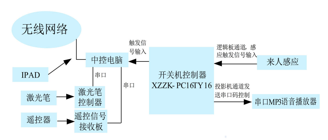 激光笔照到相应的激光接收点上,相应的灯光亮起,并播放相应的语音介绍,语音播放完毕后灯光灭。同时激光笔可以控制语音的播放、暂停、停止。